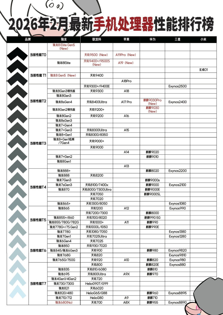 今天就跟友友一起来看看截至2026年2月的手机处理器性能排行榜,帮你做出明智选择!只要买T0-T2中的处理器,妥妥用3年以上是没有任何问题的。